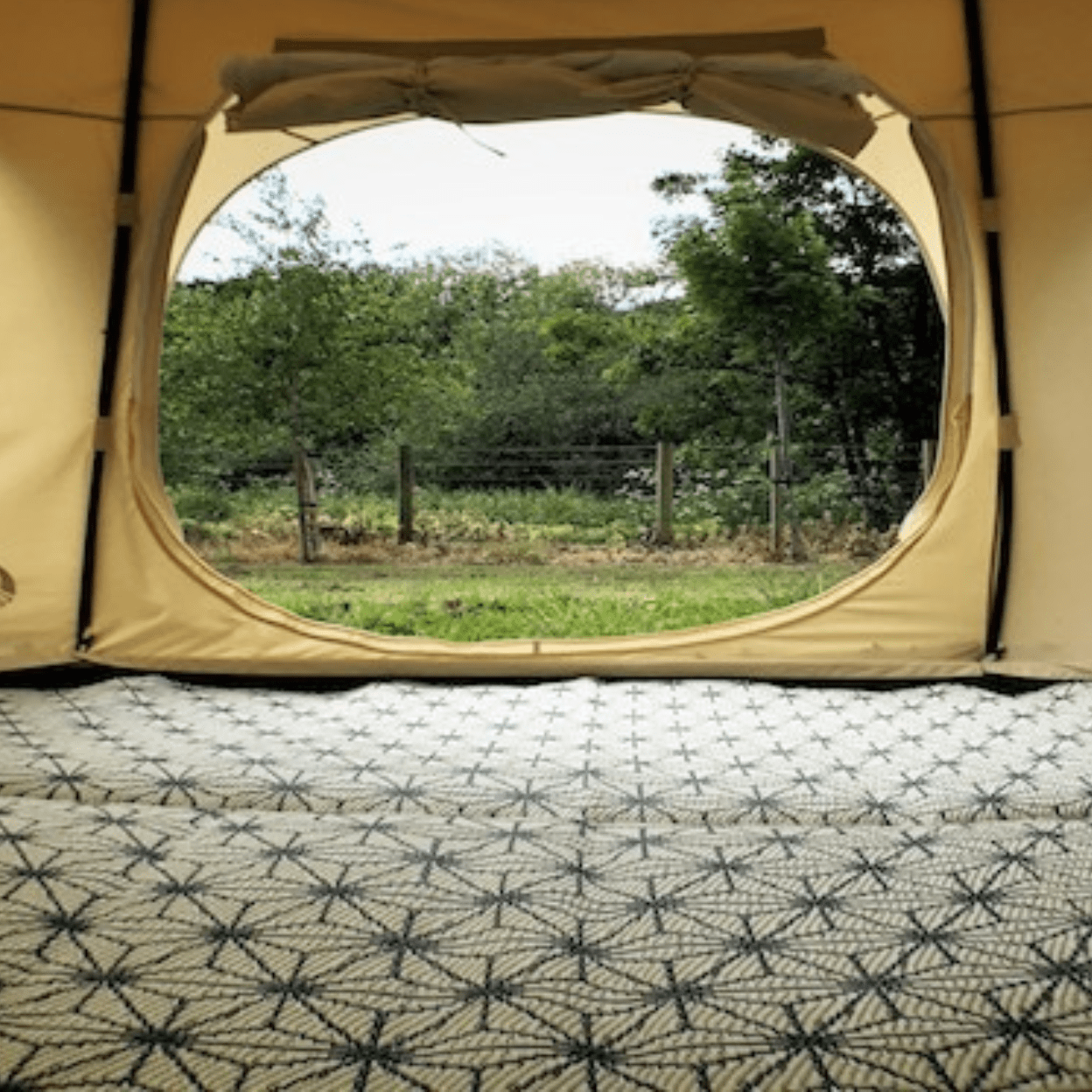 Made from recycled plastic, these mats are easy to clean, insulating and make a great simple option for tent flooring. They have double-side geometric patterns in dark blue and cream.